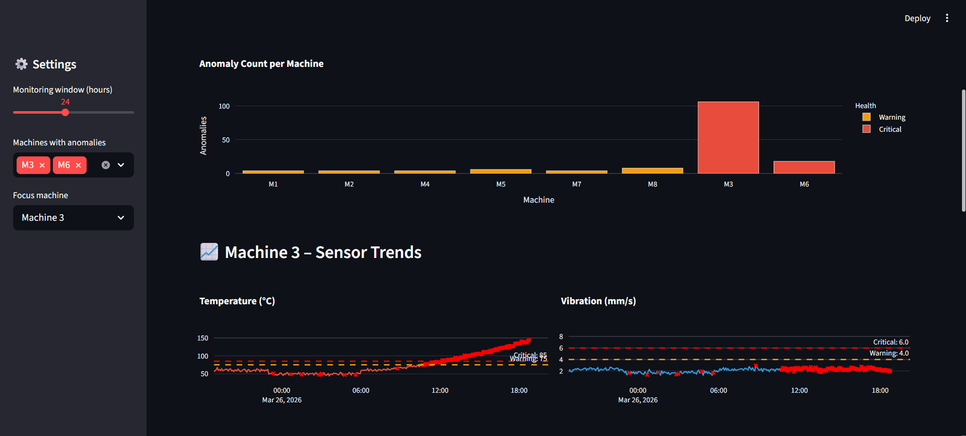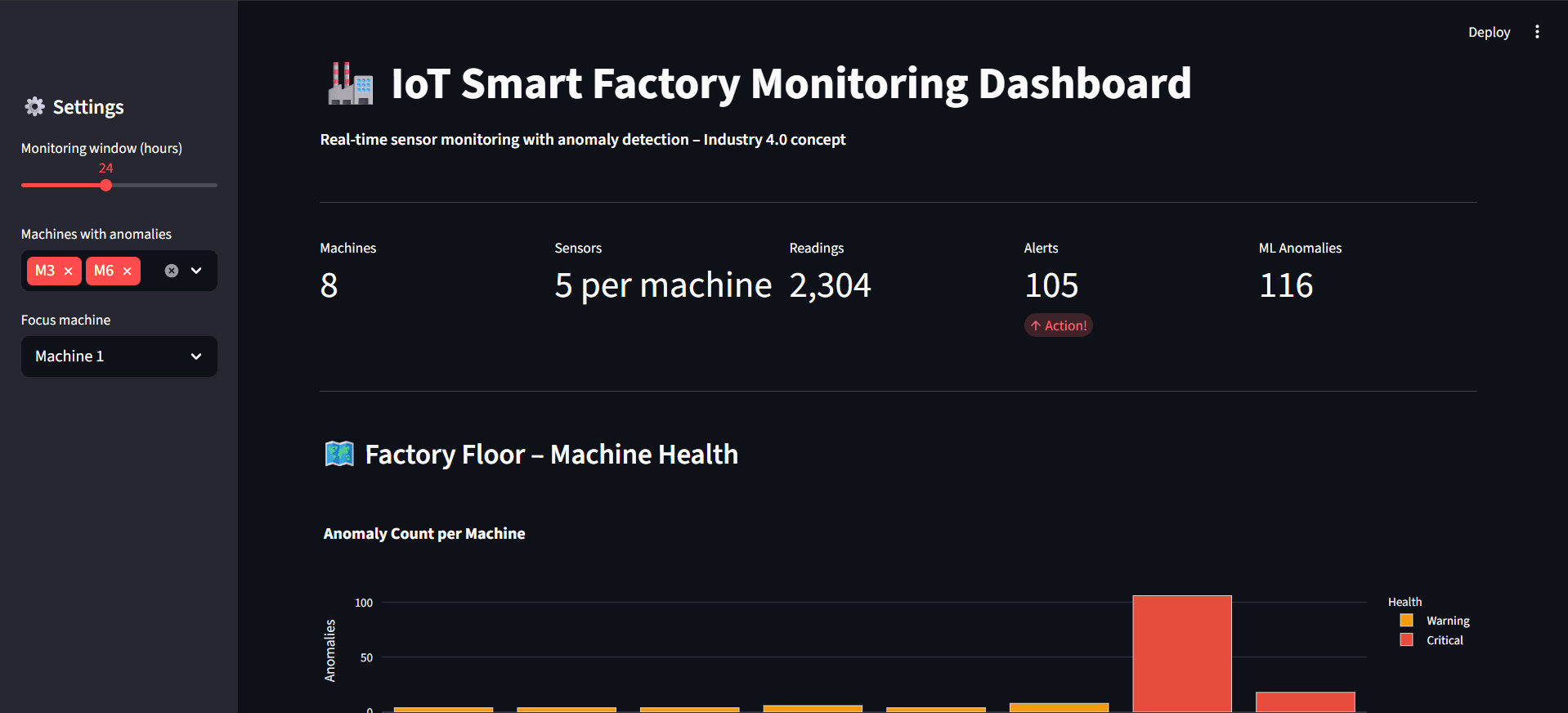 The dashboard provides factory operators with real-time visibility into machine health, combining traditional threshold-based alerting with Isolation Forest machine learning for anomaly detection. This dual approach catches both known failure patterns (threshold breaches) and unexpected deviations that rule-based systems would miss.