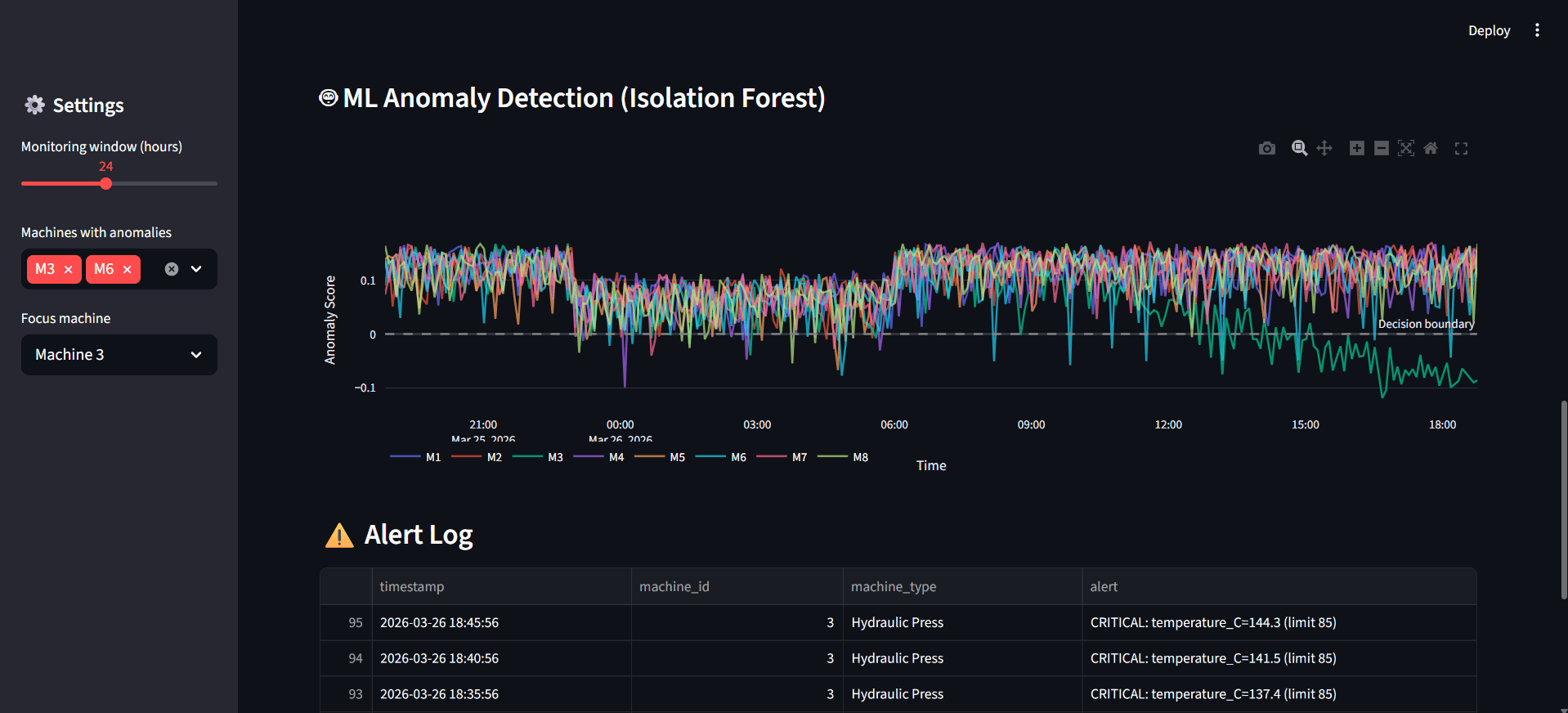 Isolation Forest anomaly scores for all 8 machines — Machine 3 (green) drops below the decision boundary as overheating progresses. Alert log shows CRITICAL temperature readings up to 144.3°C