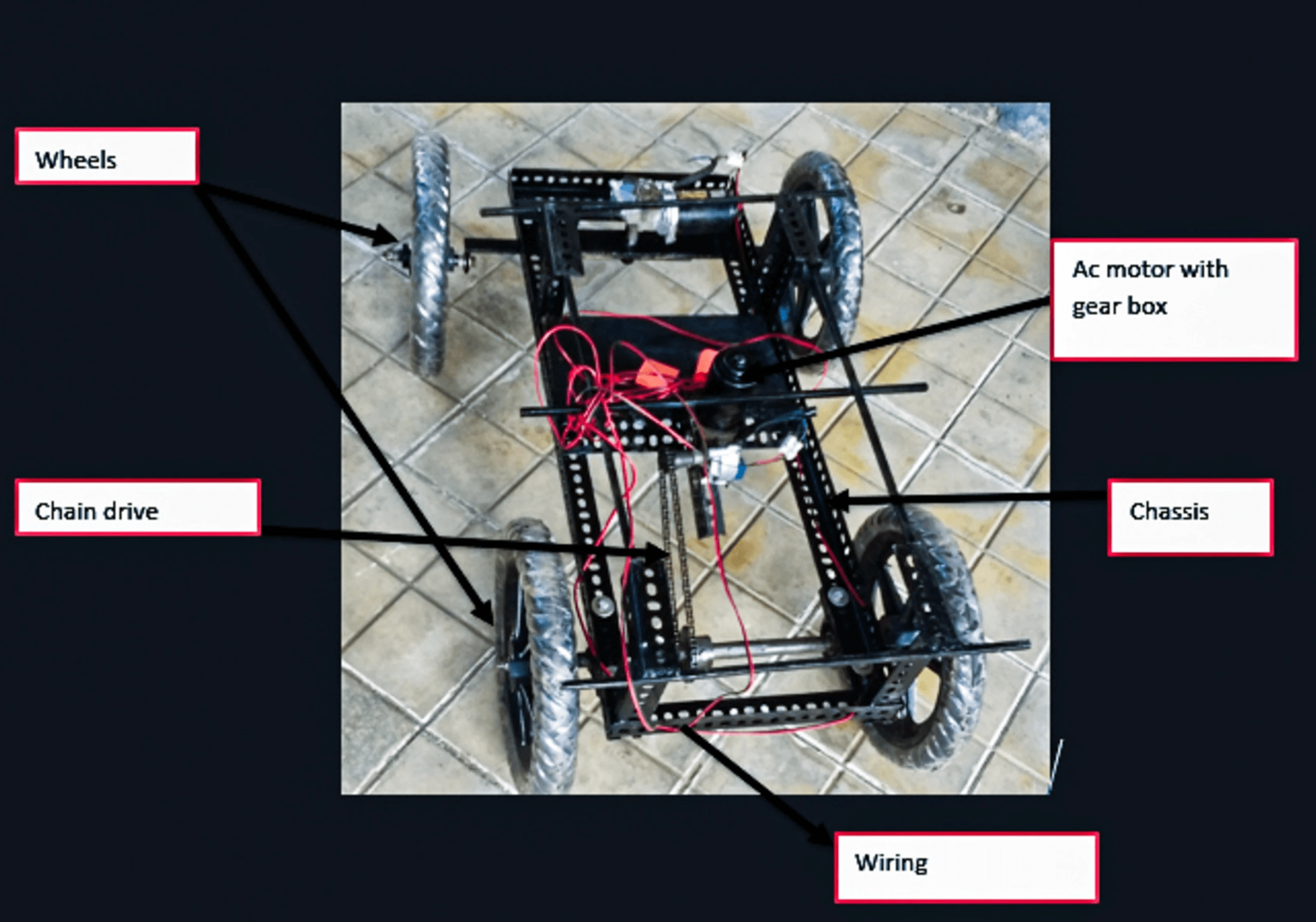 Powertrain: AC brushless motor (1 kW, 48 V) + gearbox + chain drive.